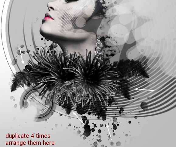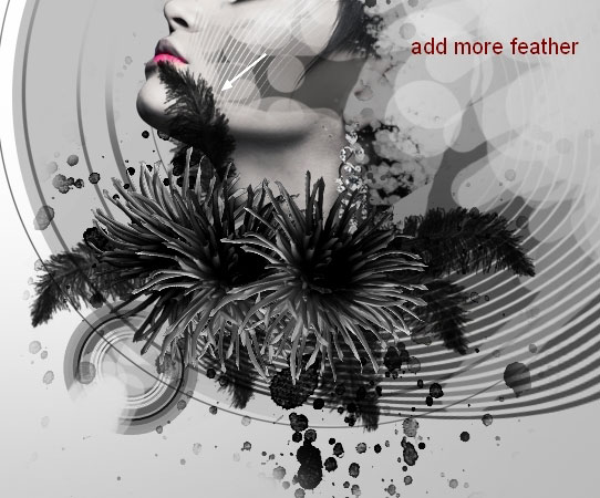 Дублируйте слой с пером четыре раза (Ctrl + J) и расположите дубликаты вокруг шеи и под цветами. При желании, слои с перьями можно трансформировать и исказить (Ctrl + T).