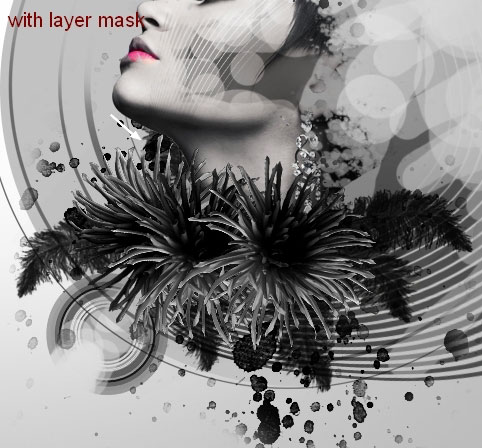 Добавьте перья над цветами, используйте слой-маску, чтобы стереть части перьев с лица модели и создать эффект, будто они находятся позади нее.