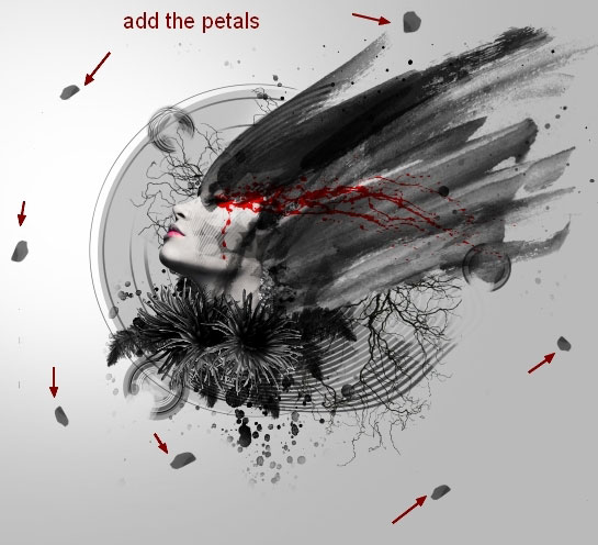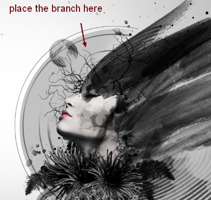 Перенесите изображение ветки в наш документ и поместите ее за головой модели. Поместите этот слой под слой «background splatter».