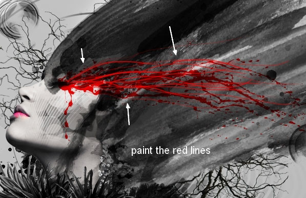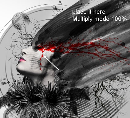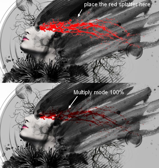 Скопируйте (Ctrl + C) и вставьте (Ctrl + V) часть красных брызг с оригинального изображения и поместите под нижнее веко модели. Измените режим наложения слоя с красными брызгами на Умножение (Multiply).