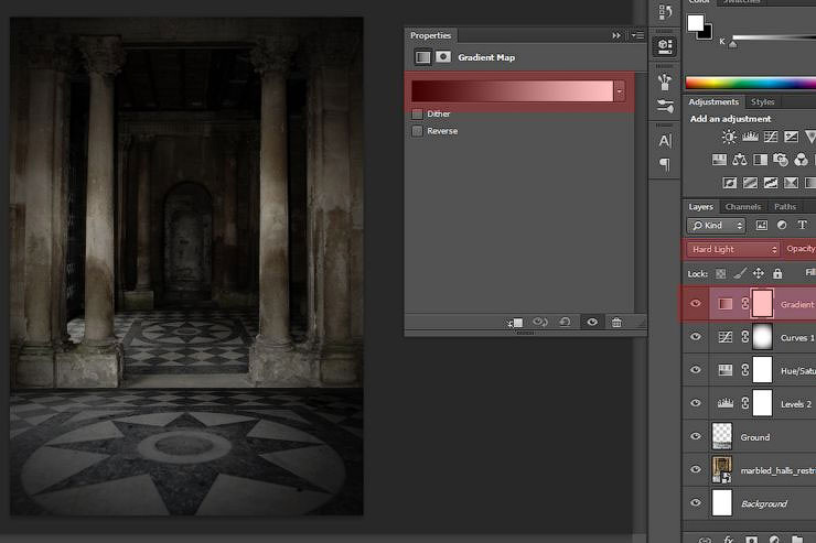 Добавьте корректирующий слой Карта градиента (Gradient Map), установите чёрно-белый градиент, а также поменяйте режим наложения для данного корректирующего слоя на Жёсткий свет (Hard Light).