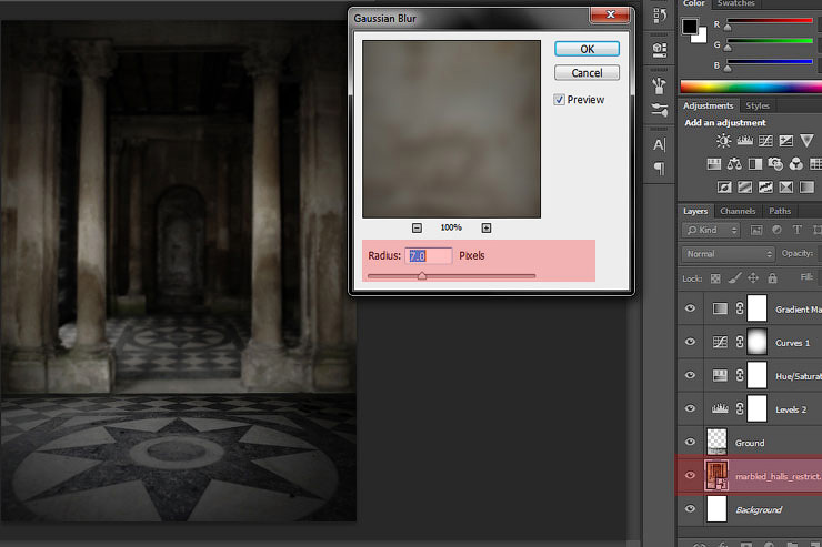 Возвращаемся на слой с нашим основным изображением с задним фоном, чтобы применить фильтр Размытие по Гауссу (Gaussian Blur), для этого идём Фильтр – Размытие – Размытие по Гауссу (Filter > Blur > Gaussian Blur), установите радиус (Radius) размытия 7%.