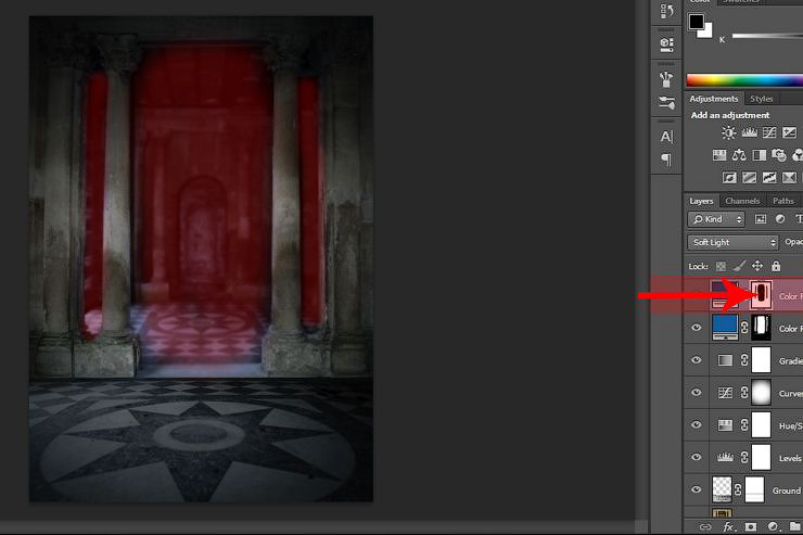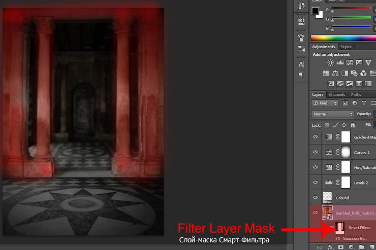 (Brush Tool (B)), размер (Size) кисти 200 px, жёсткость (Hardness) кисти 0%, а также убедитесь, чтобы цвет переднего плана был установлен на чёрный цвет. Далее, начните прокрашивать поверх колонн и фронтальных стен на изображении заднего фона, не забывайте, что кистью необходимо прокрашивать на маске фильтра (красный цвет на скриншоте ниже показывает область, где вам необходимо прокрашивать кистью)