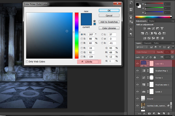 Добавьте корректирующий слой Цвет (Solid Color), установите цвет #125c9a, а также поменяйте режим наложения для данного корректирующего слоя на Жёсткий свет (Hard Light), установите Непрозрачность (Opacity) слоя 50%.