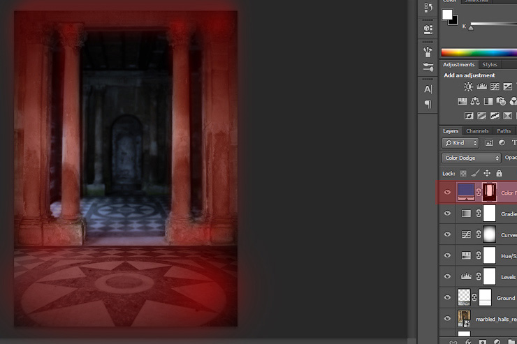 (Brush Tool (B)), установите размер (Size) кисти 250 px, жёсткость (Hardness) 0%, цвет кисти чёрный, не забывайте, что кистью необходимо прокрашивать на слой-маске корректирующего слоя Цвет (Solid Color). Начните прокрашивать кистью поверх изображения колонн и фронтальных стен (красный цвет на скриншоте ниже показывает область, где вам необходимо прокрашивать кистью).
