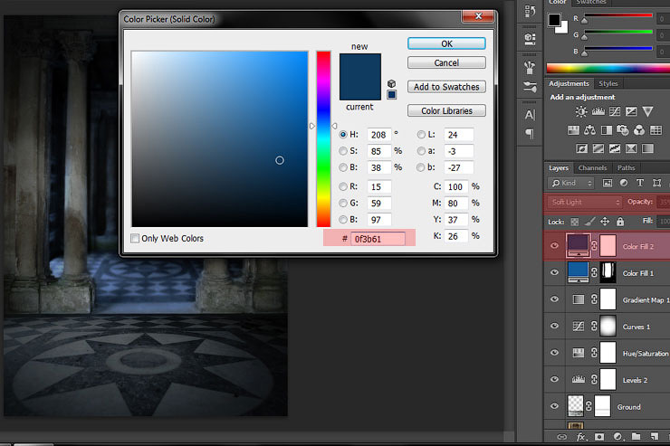 Ещё раз добавьте корректирующий слой Цвет (Solid Color), установите цвет #0f3b61. Поменяйте режим наложения для данного корректирующего слоя на Мягкий свет (Soft light), а также уменьшите Непрозрачность (Opacity) слоя до 35%.
