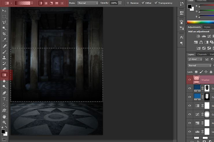 (Rectangular Marquee Tool (M)), создайте прямоугольное выделение в нижней части стен и колонн, как показано на скриншоте ниже, далее, выберите инструмент Градиент