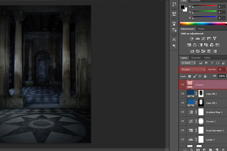 Далее, поменяйте режим наложения для слоя с тенями на Умножение (Multiply), а также уменьшите Непрозрачность (Opacity) слоя до 50%.
