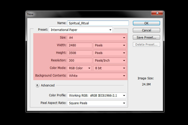 Создайте новый документ (Ctrl + N) со следующими размерами: 2480 px по ширине и 3508 px по высоте, Разрешение (Resolution) 300 px, Международный формат бумаги (International Paper), Размер (size) A4, дайте название новому документу и нажмите кнопку OK.