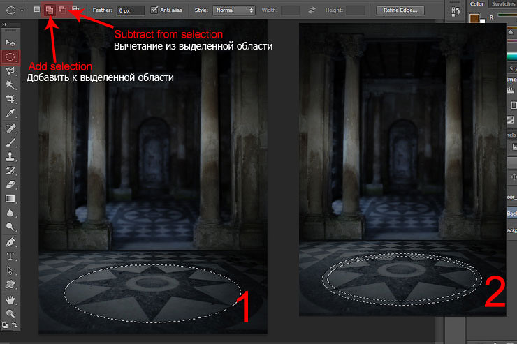 (Elliptical Marquee Tool (M)), в настройках данного инструмента установите режим Добавить к выделенной области (Add Selection). Создайте круглое выделение на полу, как показано на скриншоте ниже, не меняя инструмент, поменяйте режим на Вычитание из выделенной области (Subtract Selection), создайте выделение в середине первого выделения, как показано на скриншоте ниже.