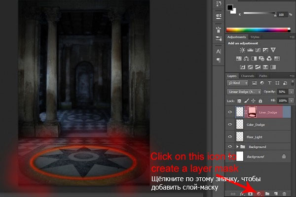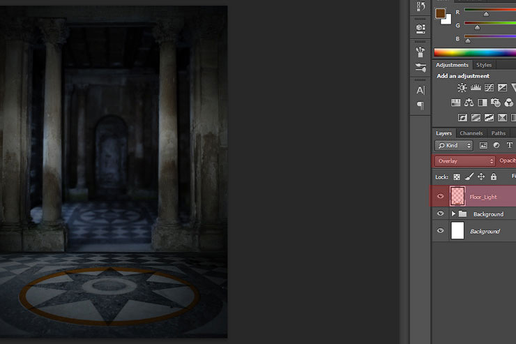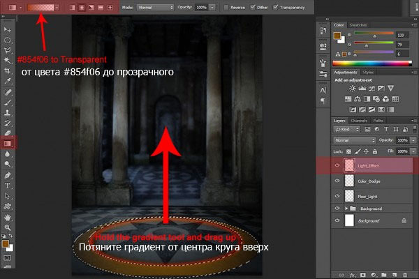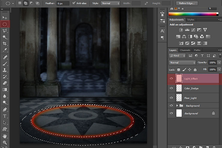 Давайте добавим свет на мраморный пол. Создайте новый слой, назовите этот слой ‘Напольный свет’, выберите инструмент Овальная область