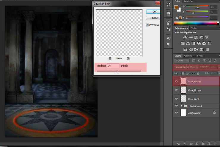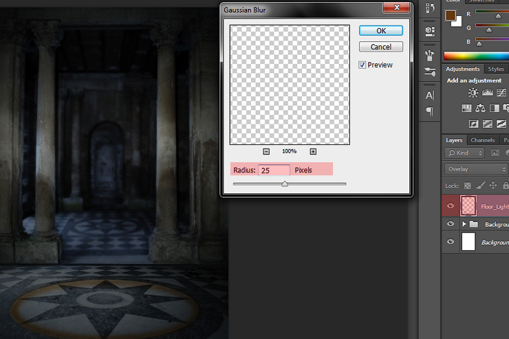 Далее, идём Фильтр – Размытие – Размытие по Гауссу (Filter > Blur > Gaussian Blur), установите Радиус (Radius) размытия 25.