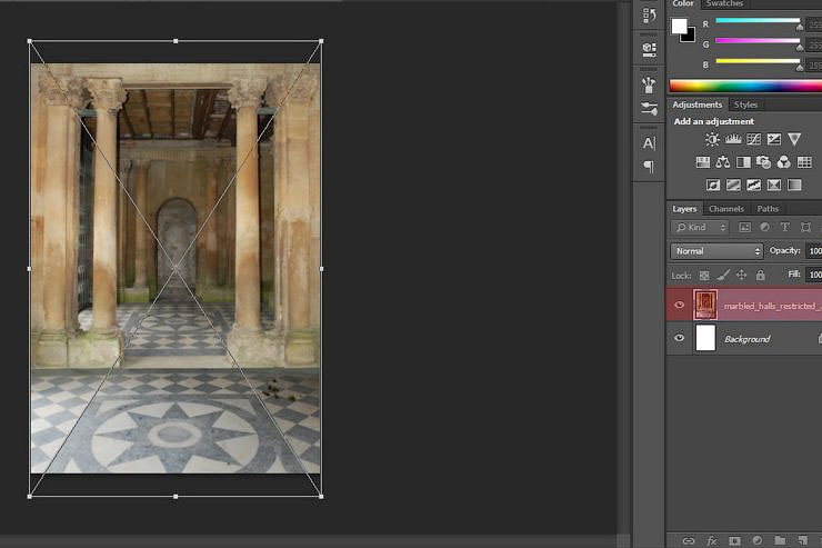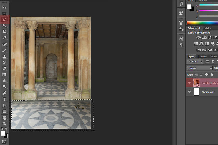 Мраморный пол на изображении не походит в перспективе к изображению модели, которую мы добавим позже, поэтому нам нужно исправить это с помощью инструмента перспективы. Вначале выберите инструмент Лассо