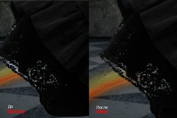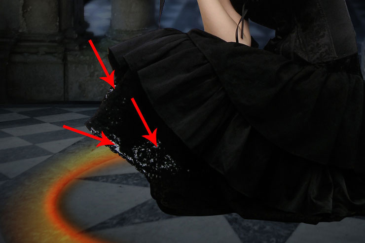 (Brush Tool (B)), размер (Size) кисти 600 px, жёсткость (Hardness) 0%, цвет кисти #ff7200. Прокрасьте края нижней части платья модели, как показано на скриншоте ниже (красный цвет на скриншоте ниже показывает участки, где вы должны прокрашивать кистью).