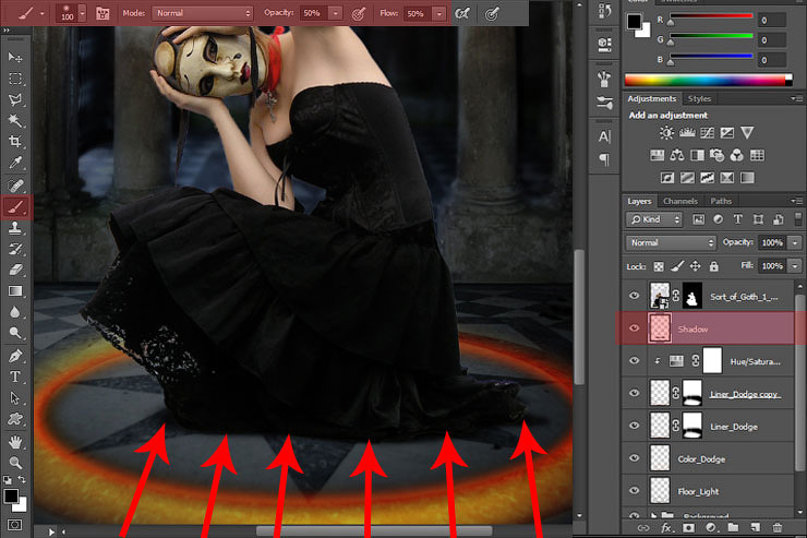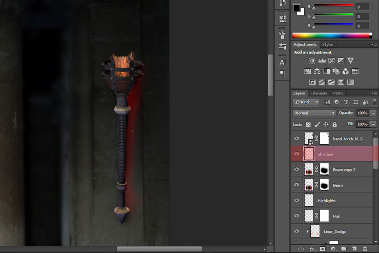 Создайте новый слой, расположите данный слой ниже слоя с факелом, назовите этот слой ‘Тени’. Выберите инструмент Кисть