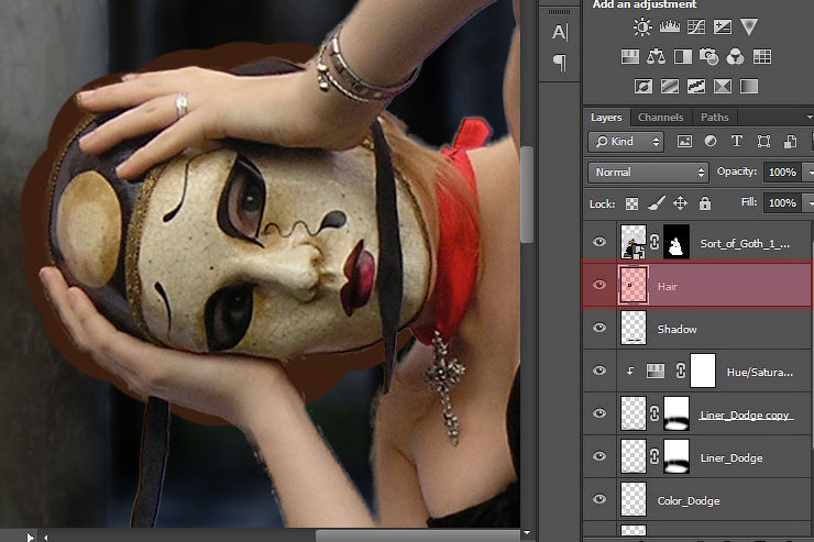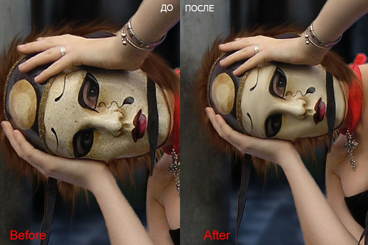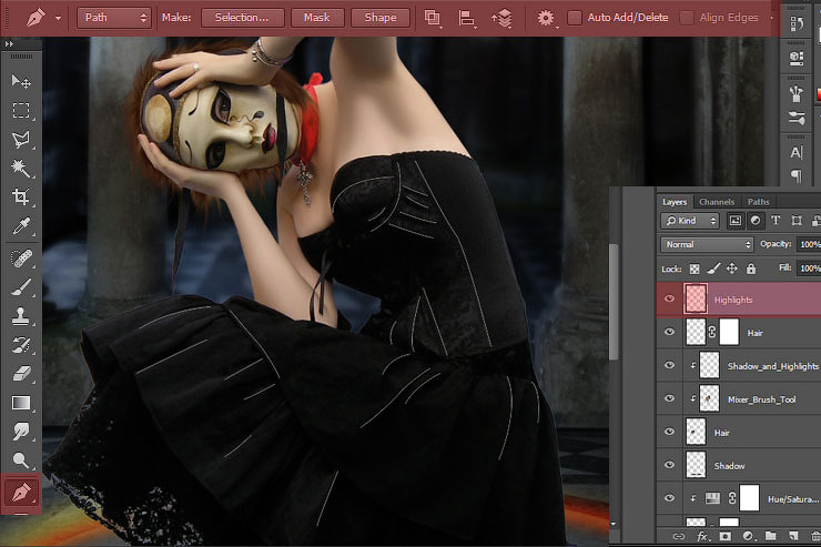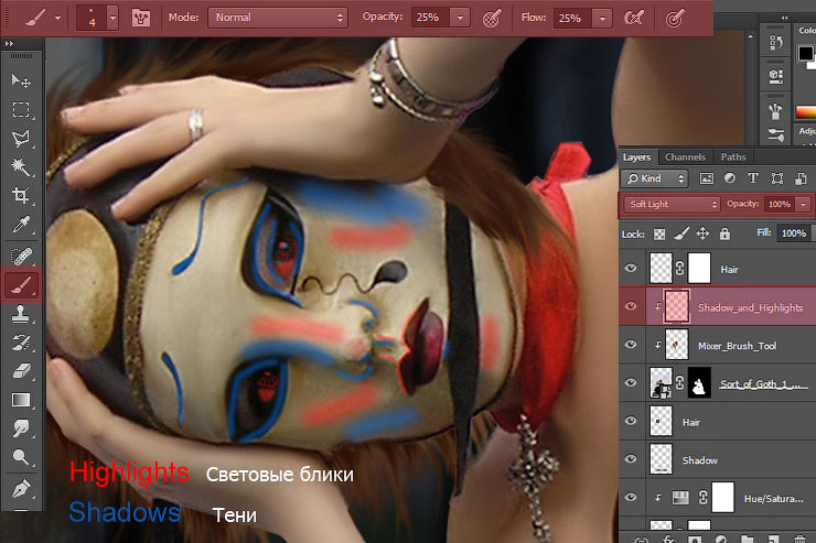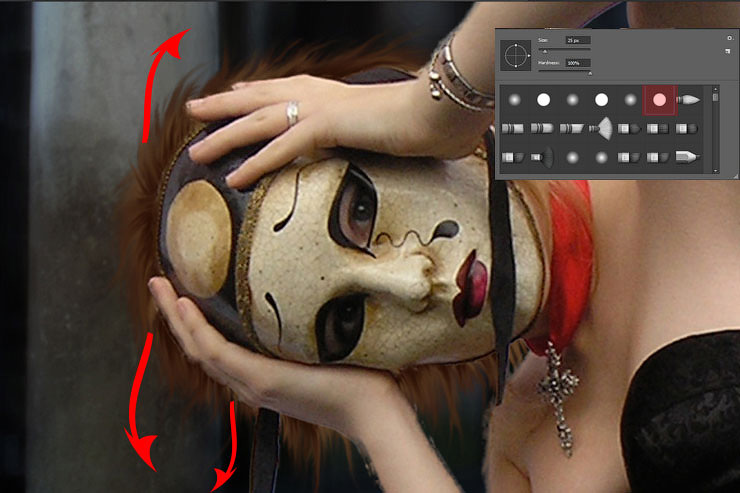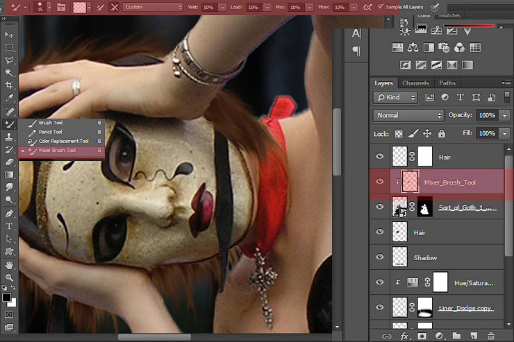 (Mixer Brush Tool), т.к. мы уже использовали данный инструмент во время ретуши маски. Также будьте аккуратны, постарайтесь не смешать светотени.