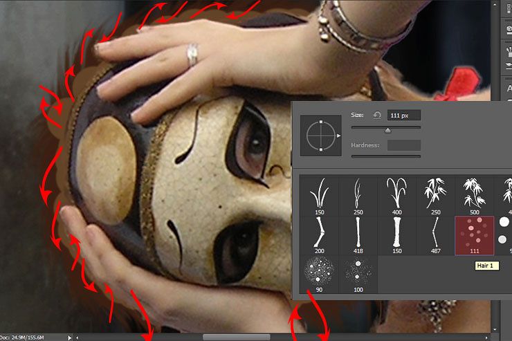 (Smudge Tool) и таким же образом примените данный инструмент, размазывая волосы, только поменяйте кисть Волосы 2 (Hair 2) на кисть Волосы 1 (Hair 1).