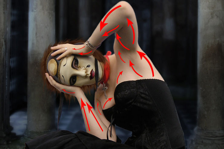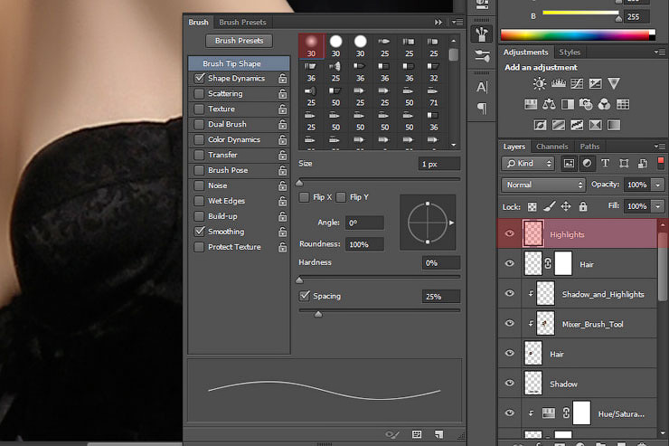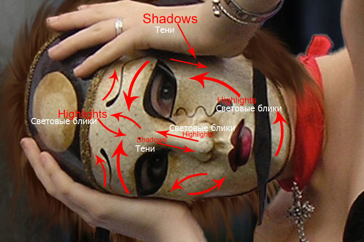 Вам нужно быть очень аккуратными и стараться не смешивать света и тени. Вначале проведите ретушь маски модели. Чтобы смешать цвета, наведи инструмент на область со светлым участком, нажмите, удерживайте, проведите кистью, затем наведите инструмент на участок с тенью, нажмите, удерживайте, проведите кистью, и как я уже ранее говорил, старайтесь не смешивать света и тени (на скриншоте ниже, вы можете увидеть, где вы должны удерживать и проводить кистью).