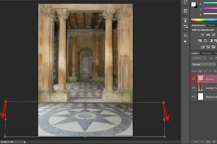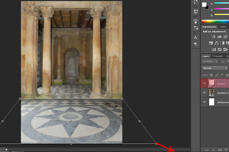 Идём Редактирование – Трансформация – Перспектива (Edit > Transform > Perspective), потяните за правую нижнюю опорную точку, чтобы изменить перспективу мраморного пола.