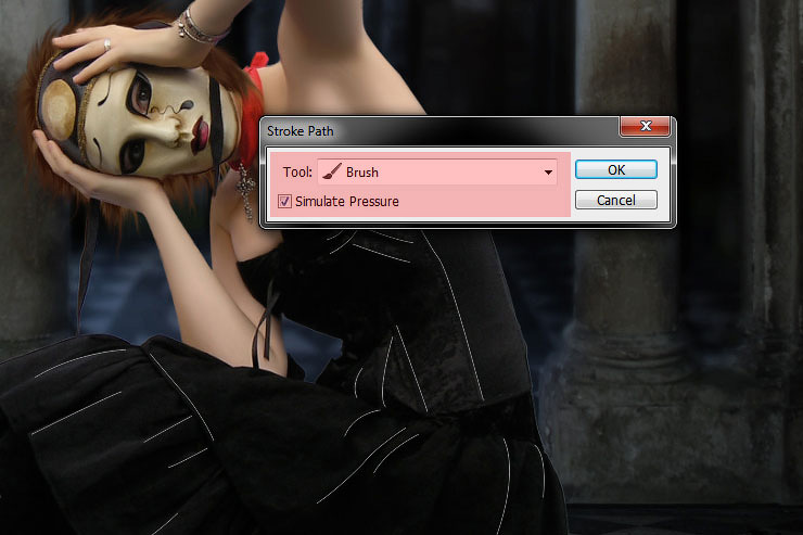 После того, как вы нарисуете все линии и кривые, щёлкните правой кнопкой мыши по рабочей области и в появившемся окне выберите опцию Выполнить обводку контура (Stroke Path), затем установите кисть в качестве инструмента обводки, а также поставьте галочку в окошке Имитировать нажим (Simulate Pressure).