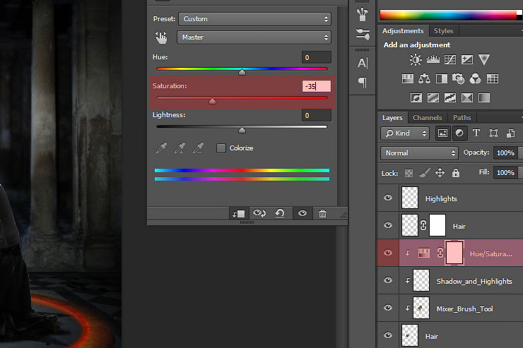 Теперь давайте совместим изображение модели с задним фоном. Вначале давайте добавим новый корректирующий слой Цветовой тон / Насыщенность (Hue/Saturation). В окне настроек данного корректирующего слоя установите значение Насыщенности (Saturation) -35. Расположите данный корректирующий слой поверх слоя ‘Светотени’, а затем преобразуйте его в обтравочную маску к слою с моделью, так же, как и другие слои, которые мы применили в качестве обтравочных масок к слою с моделью.
