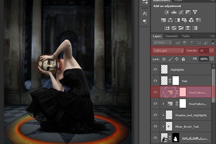 Продублируйте корректирующий слой Цветовой тон / Насыщенность (Hue/Saturation) (Ctrl+J), для данного дубликата корректирующего слоя поменяйте режим наложения на Мягкий свет (Soft light), уменьшите Непрозрачность (Opacity) до 25%, а также преобразуйте его в обтравочную маску к слою с моделью.
