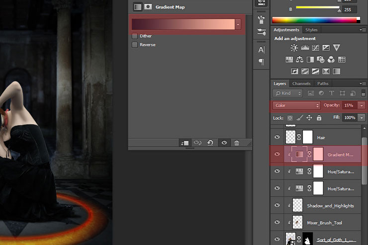 Далее, добавьте корректирующий слой Карта Градиента (Gradient Map), для теней установите цвет #042135, а для светлых бликов, установите цвет #fef0d2, затем поменяйте режим наложения на Цветность (Color), а также уменьшите непрозрачность слоя до 15%, и не забудьте преобразовать данный корректирующий слой в обтравочную маску, так же, как и другие слои.