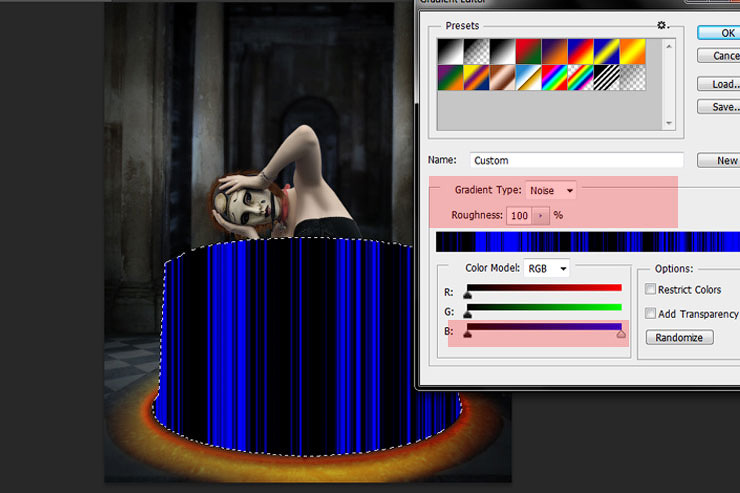 (Gradient Tool (G)), в настройках данного инструмента, установите тип градиента Линейный (Linear), щёлкните по шкале градиента, чтобы открыть окно настроек градиента, в строке Градиент (Gradient Type), выберите Шум (Noise), как показано на скриншоте ниже. Потяните градиент по горизонтали.