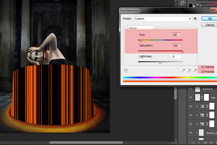 Далее, идём Изображение – Коррекция – Цветовой тон / Насыщенность (Image > Adjustments > Hue/Saturation), поставьте галочку в окошке Тонирование (Colorize). Установите значение Цветового тона (Hue) на 22, а значение Насыщенности (Saturation) на 100%.