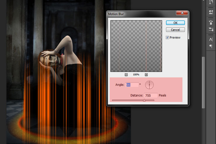 Далее, идём Фильтр – Размытие - Размытие в движении (Filter > Blur > Motion Blur). Установите Угол (Angle) на 90%, а Смещение (Distance) на 755.