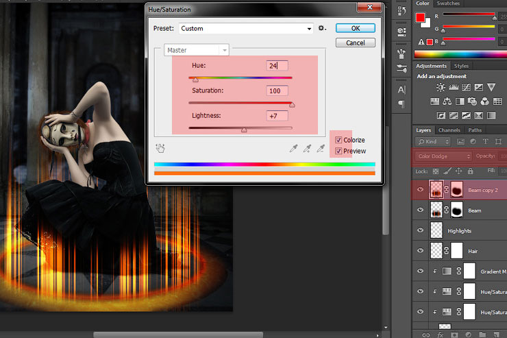 Возвращаемся к оригинальному слою с лучами, продублируйте этот слой (Ctrl+J), поменяйте режим наложения для дубликата слоя на Осветление основы (Color Dodge). Затем идём Изображение – Коррекция – Цветовой тон / Насыщенность (Image > Adjustment > Hue/Saturation), поставьте галочку в окошке Тонирование (Colorize) и установите Цветовой тон (Hue) на 24, Насыщенность (Saturation) на 10, а Яркость (Lightness) на +11.