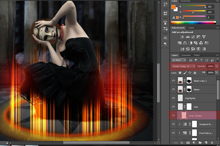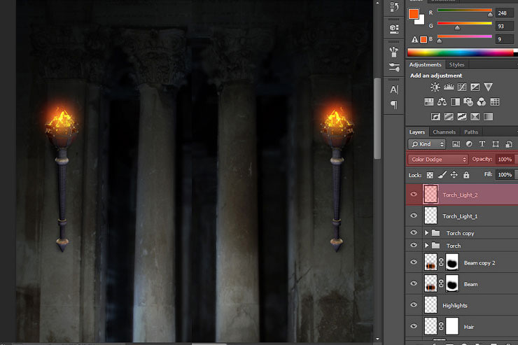 Ещё раз создайте новый слой, назовите этот слой ‘Свет факела 2’. Поменяйте режим наложения для данного слоя на Осветление основы (Color Dodge). С помощью кисти, цвет кисти #f85d09, ещё раз прокрасьте верхнюю часть огня.