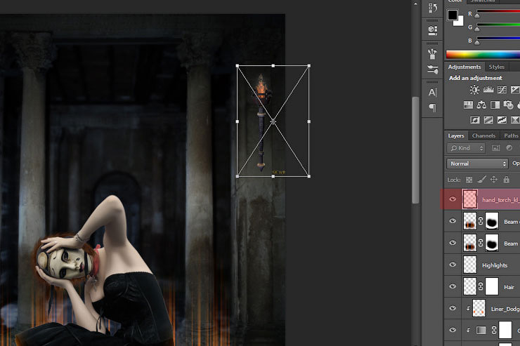 Идём Файл – Поместить (File > Place) и добавляем исходное изображение Факела. Расположите изображение факела, как показано на скриншоте ниже. Как только вы разместили данное изображение, добавьте слой-маску, чтобы скрыть надпись, расположенную под факелом, а также скройте верхнюю часть огня, поскольку мы добавим свой собственный огонь.