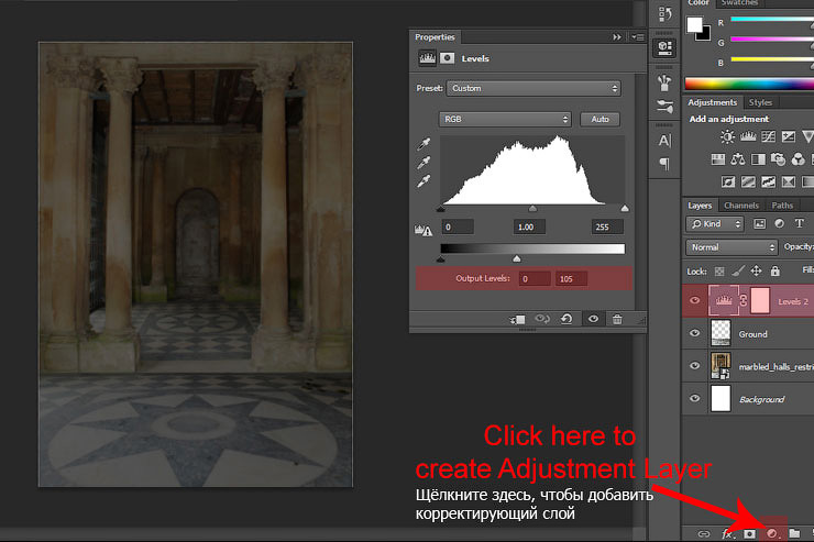 Добавьте корректирующий слой Уровни (Levels), установите Выходные значения (Output Levels) на 0, 105