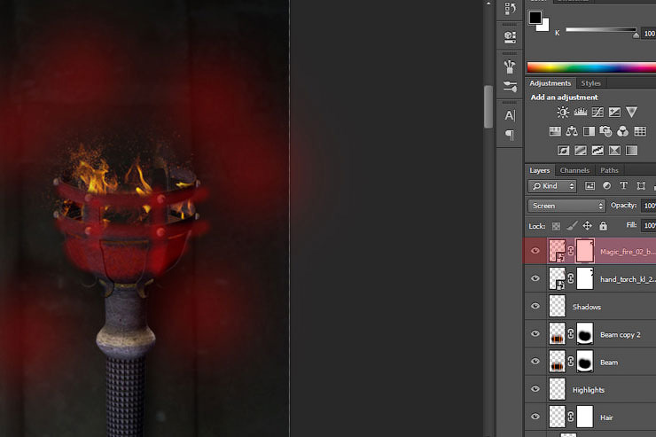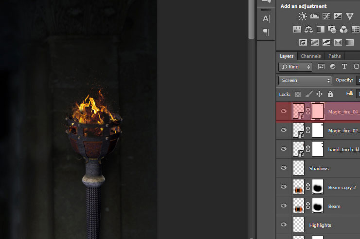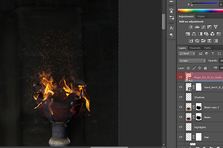 Далее, мы добавим изображение огня, для этого идём Файл – Поместить (File > Place) и в появившемся окне выбираем текстуру огня. Примените инструмент Трансформация (Transform Tool (Ctrl+T)) для масштабирования текстуры огня. Расположите огонь в чаше рукояти факела, поменяйте режим наложения для слоя с текстурой огня на Осветление (Screen).