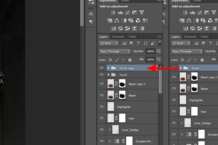 Создайте новую группу, поместите все слои, относящиеся к факелу и огню, в созданную группу. Далее, щёлкните правой кнопкой по слою с группой и в появившемся окне выберите опцию Создать дубликат группы (Duplicate Group).