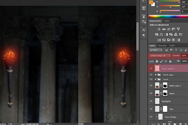 Создайте новый слой, назовите этот слой ‘Свет факела 1’. Поменяйте режим наложения для данного слоя на Линейный осветлитель (Linear Dodge), установите Непрозрачность (Opacity) слоя 50%, выберите мягкую кисть небольшого диаметра, цвет кисти #f68909. Прокрасьте кистью верхнюю часть огня, чтобы добавить свечение к огню, как показано на скриншоте ниже.