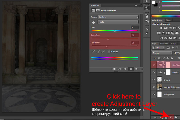 Далее, добавьте другой корректирующий слой, на этот раз выберите Цветовой тон / Насыщенность (Hue/Saturation), установите Насыщенность (Saturation) на -30, а Яркость (Lightness) на -35.