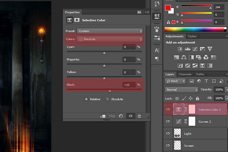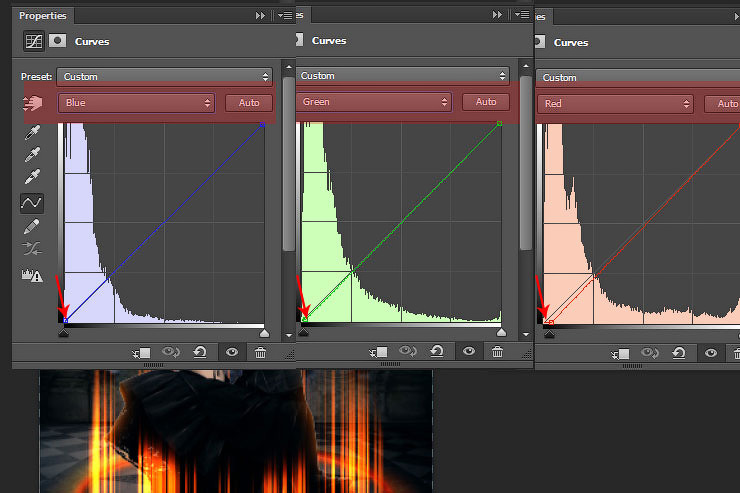 Добавьте корректирующий слой Кривые (Curves) поверх всех остальных слоёв, установите кривые, как показано на скриншоте ниже. Всего лишь слегка сместите бегунок для Теней для зелёной, красной и синей кривой.
