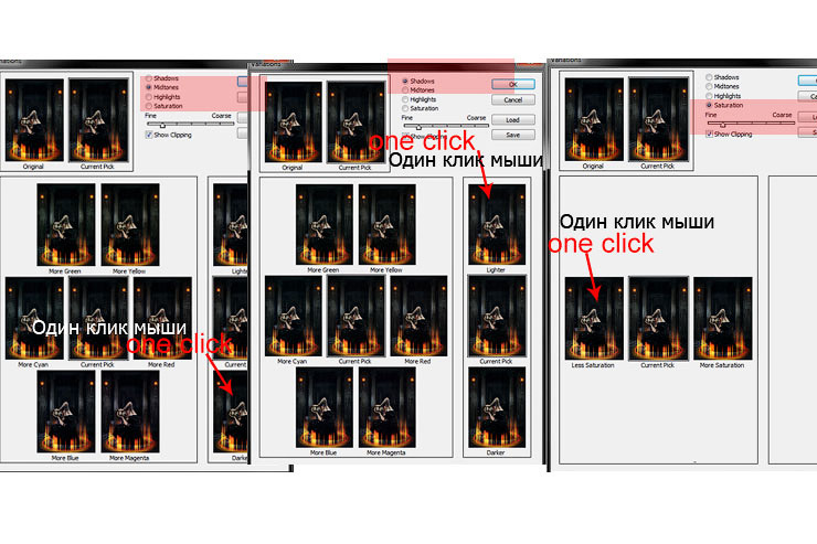 Примечание переводчика: по очереди выбирайте варианты: 1. Средние тона (Midtones) 2. Тени (Shadows) 3. Насыщенность (Saturation).
