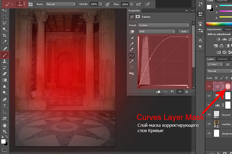 (Brush Tool (B)), установите размер (Size) кисти, примерно на 3300 px, Жёсткость (Hardness) кисти 0%, цвет кисти белый. Начните прокрашивать центральную часть изображения (не забывайте, что прокрашивать кистью нужно на слой-маске корректирующего слоя Кривые (Curves)), чтобы показать эффект кривых в этой части изображения, а также скрыть эффект кривых на краях изображения (красный цвет на скриншоте ниже показывает область обработки кистью).