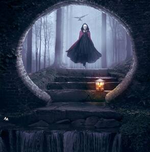 Сначала мы создадим основу, используя фото леса и ступеней. Затем добавим водопад, птицу, арку и фонарь и объединим все это с помощью корректирующих слоев, масок и кистей. В конце мы добавим еще несколько корректирующих слоев и нарисуем свет от фонаря.