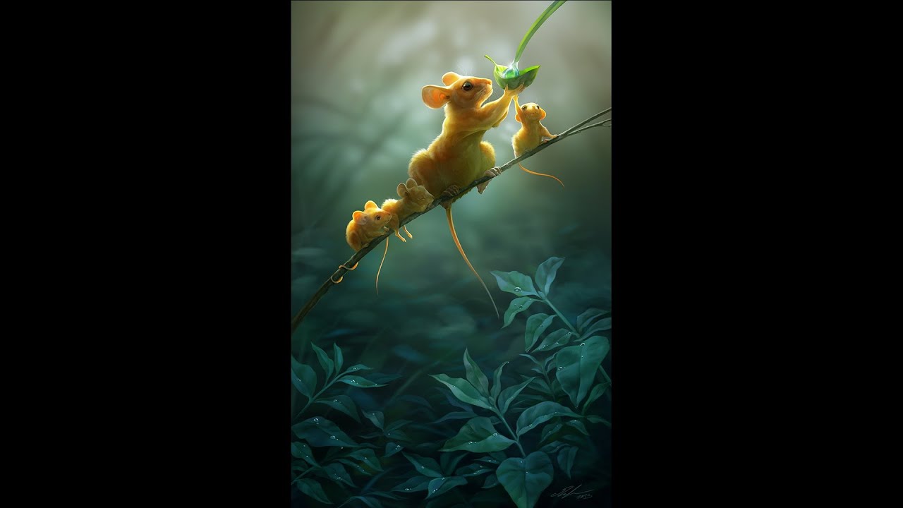 Верхняя часть фона слишком темная, поэтому я решила немного осветлить ее с помощью точечного света, как будто солнечные лучи пробиваются сквозь листву. Для этого используем максимально мягкую круглую кисть. Кроме того, я аккуратно начала вырисовывать маленьких мышат, используя ту же технику, что и с их мамой. Добавляем новый слой, затем привязываем его к слою с основой мышат. Грубой кистью наносим базовые цветовые переходы.