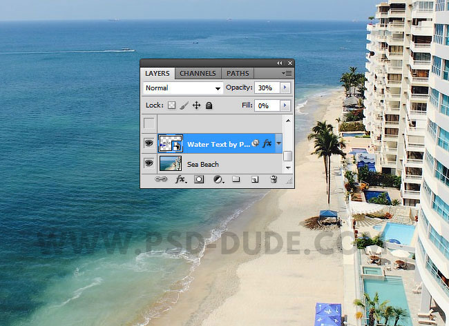Текст на водной поверхности должен выглядеть, как на скриншоте ниже. Т.к. мы преобразовали слой с текстом в смарт-объект, то вы в любое время можете поменять сам текст, его форму и шрифт.
