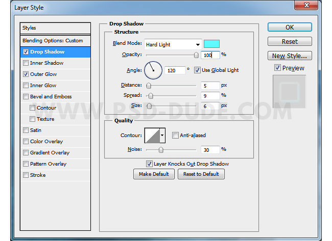 Для стиля слоя Тень (Drop Shadow), установите следующие настройки: