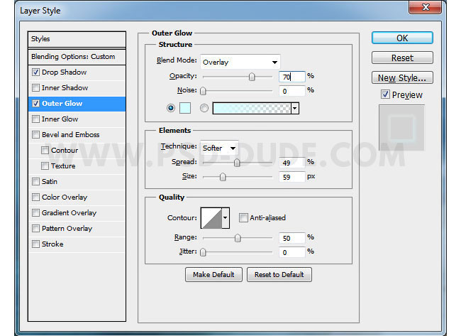 Для стиля слоя Внешнее свечение (Outer Glow), установите следующие настройки: