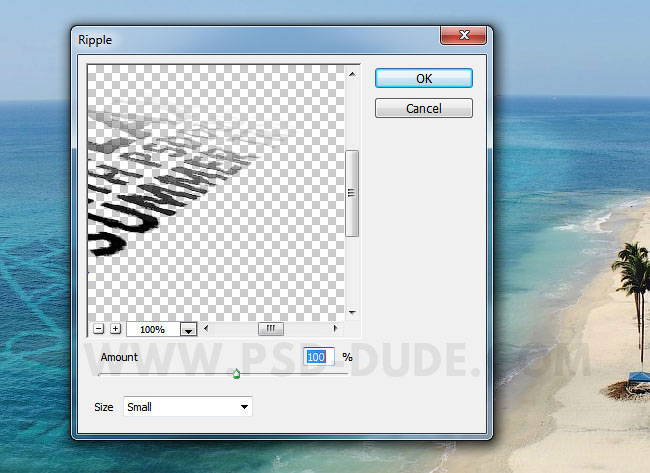 Чтобы отражение текста на водной поверхности было более реалистичным, многие пользователи программы Photoshop используют Фильтр Смещение (Displace) программы Photoshop, вы можете ознакомиться с уроками по созданию эффектов искажения по указанной ссылке. Но т.к. эта техника слишком сложная, то мы используем фильтр Рябь (Ripple Filter) вместо указанного ранее фильтра. Итак, идём Фильтр - Искажение – Рябь (Filter - Distort - Ripple). Установите настройки, которые указаны на скриншоте ниже.