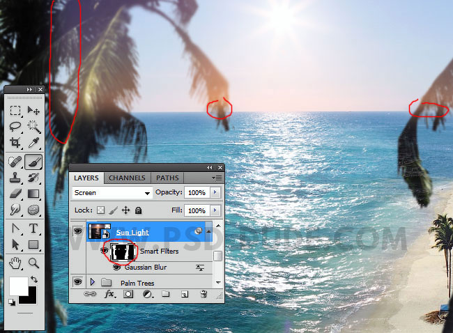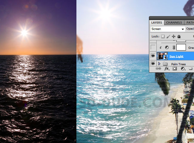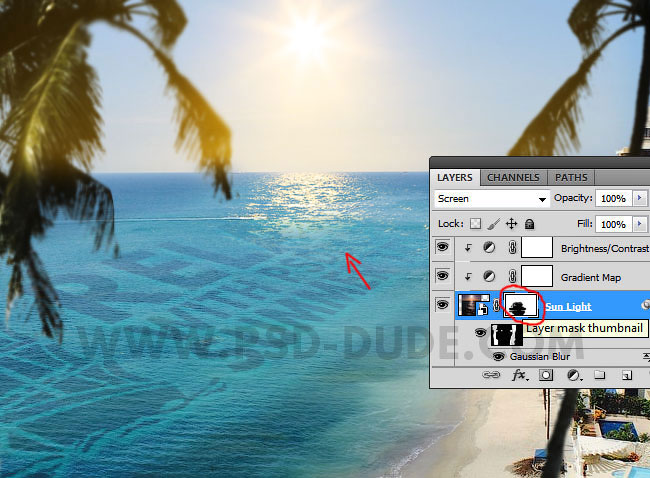 К слою с солнечным бликом, добавьте слой-маску и с помощью мягкой чёрной кисти скройте эффект отражения солнечного света на морской поверхности, как показано на скриншоте ниже.