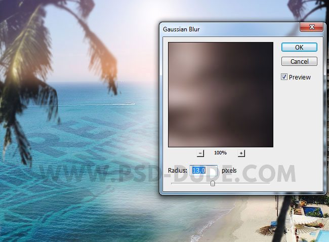 К слою с солнечным бликом, примените фильтр Размытие по Гауссу (Gaussian Blur), для этого идём Фильтр – Размытие - Размытие по Гауссу (Filter > Blur > Gaussian Blur).