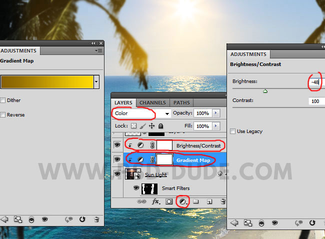 Чтобы изменить цветовую тональность, а также яркость эффекта, вы можете добавить корректирующие слои Карта градиента (Gradient Map), (цвета градиента: #886203 и #fed903, режим наложения Цветность (Color)) и Яркость / Контрастность (Brightness/Contrast). Не забудьте преобразовать данные корректирующие слои в обтравочные маски, для этого, щёлкните правой кнопкой мыши по корректирующему слою в палитре слоёв и в появившемся окне выберите опцию Создать обтравочную маску (Create Clipping Mask).